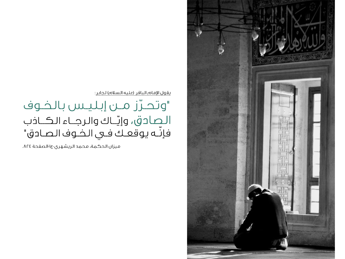 يقول الإمام الباقر (عليه السلام) لجابر: "وتحرّز من إبليس بالخوف الصادق، وإيّاك والرجاء الكاذب فإنّه يوقعك في الخوف الصادق"[1]، فإن رُمتَ أن تُصان من شرّ الشيطان فعليك بالخوف الصادق وتجنّب الرجاء الكاذب! لأنّه يوقعك في موقف يستدعي منك الخوف الصادق. فإذا كان للمرء رجاء كاذب في شيء, كأن يقول: إنّني أرجو رحمة الله، ثمّ لا يسعى لكسبها، فسيوقعه هذا الرجاء الكاذب في فخّ المعصية التي ستجعله في موقف يستلزم منه خوفاً صادقاً، أي العذاب، وقد تكرّرت عبارة: "الخوف الصادق" في هذا المقطع مرّتين مع فارق بسيط بين الاثنين، فعندما يقول (عليه السلام): "وتحرّز من إبليس بالخوف الصادق" فهو يقصد: حاول أن تستشعر خوفاً جدّياً، وعندما يقول: "وإيّاك والرجاء الكاذب فإنّه يوقعك في الخوف الصادق" فهو يريد: أنّ رجاءك الكاذب سيوقعك في فخّ الخطيئة التي ستجعلك في موقف يتطلّب منك خوفاً صادقاً. وكأنّ كلمة: "موقف" هي مقدّرة قبل عبارة: "الخوف الصادق" وقد حُذفت"[2].