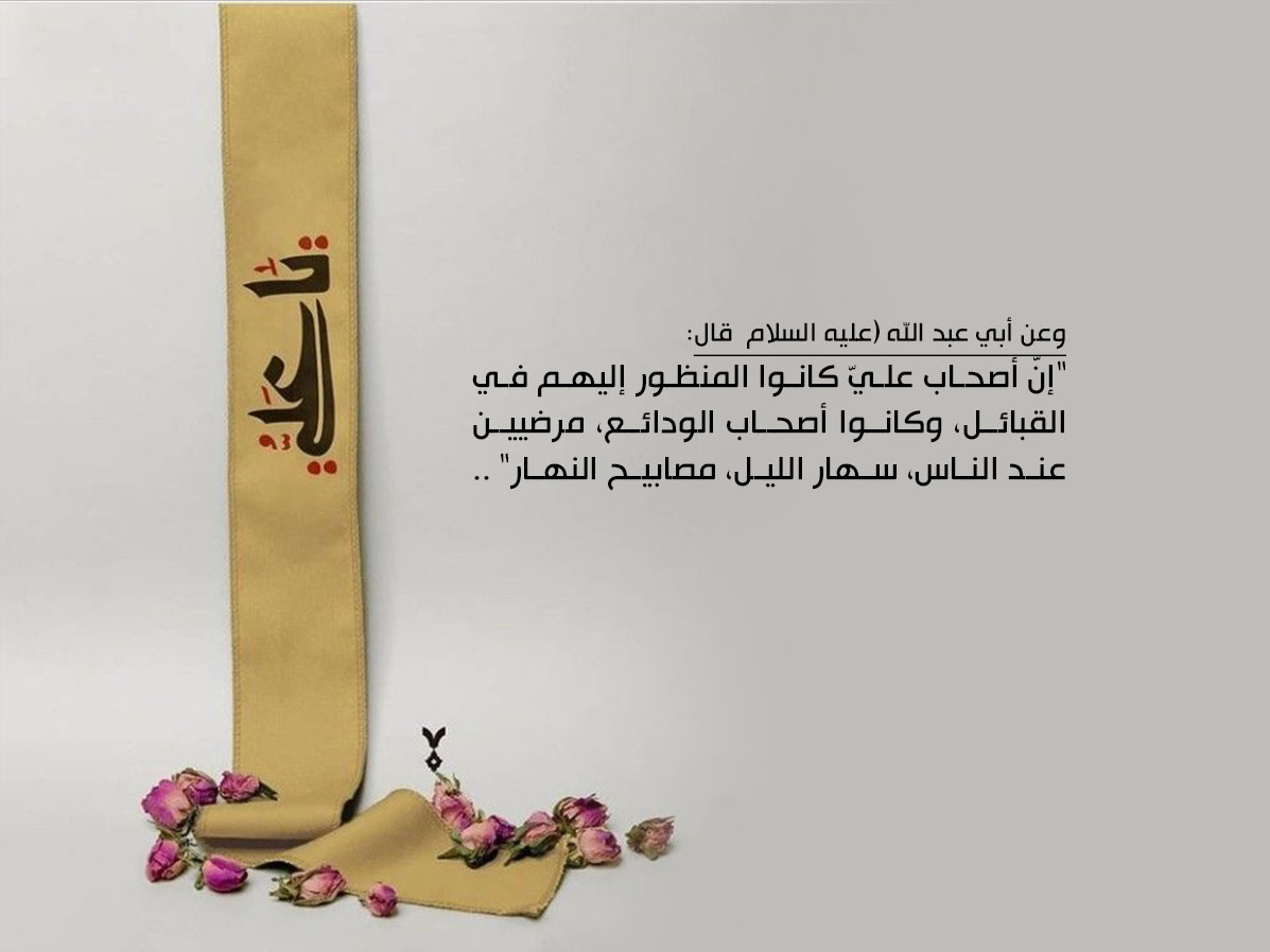 - وعن أبي عبد الله (عليه السلام )ي رواية أخرى قال: "إنّ أصحاب عليّ كانوا المنظور إليهم في القبائل، وكانوا أصحاب الودائع، مرضيين عند الناس، سهار الليل، مصابيح النهار"[4].