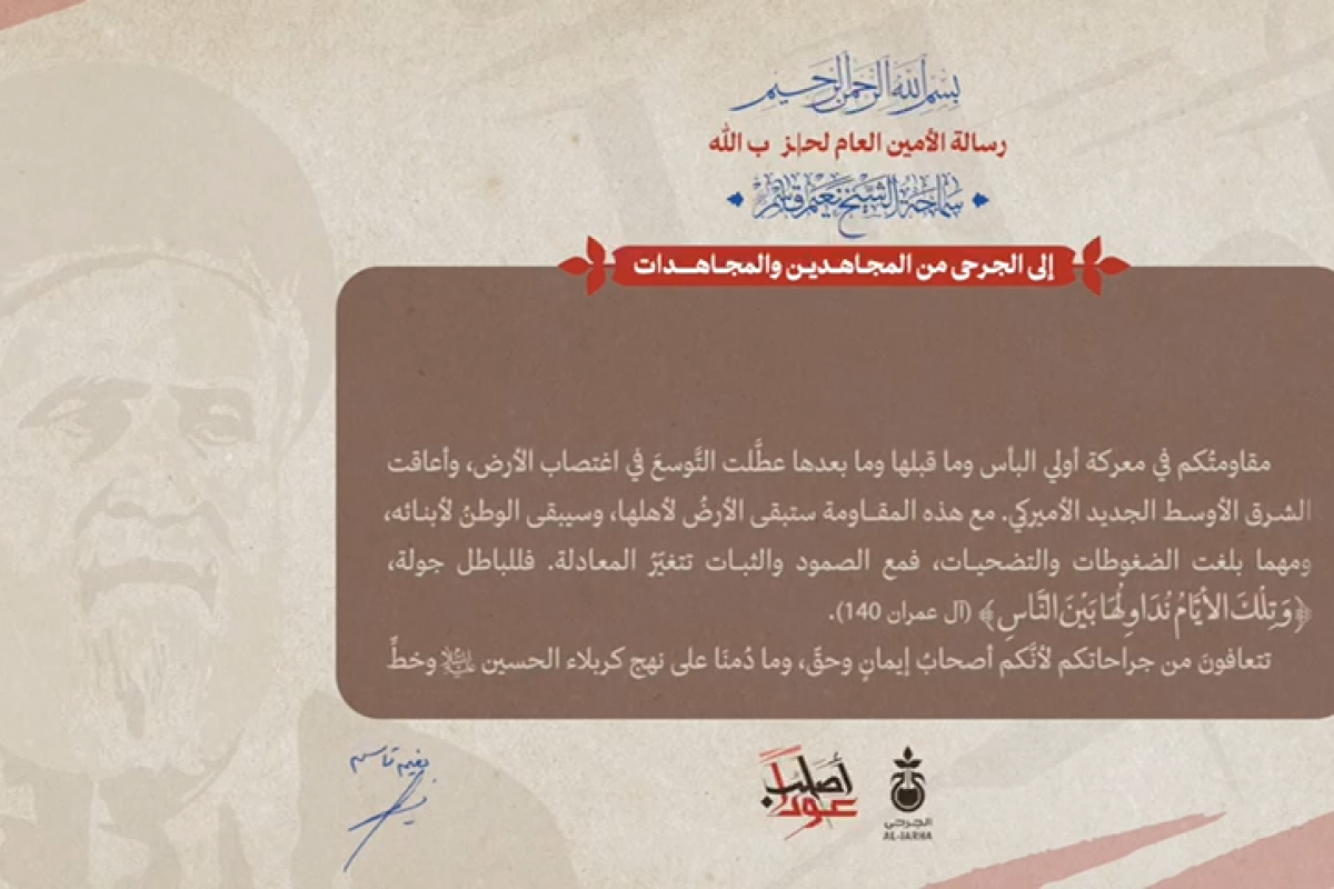 نحن مع الحق، مع الشرف، مع الكرامة، مع الوطن، مع تحرير الأرض، مع الوفاء لدماء الشهداء، وعلى رأسهم الشهيد الأسمى، سيد شهداء الأمة، السيد حسن نصر الله رضوان الله تعالى عليه، والسيد الهاشمي، وكلّ الشهداء والجرحى والأسرى، نحن مع العوائل الشريفة التي قدمت وضحّت ولا زالت.