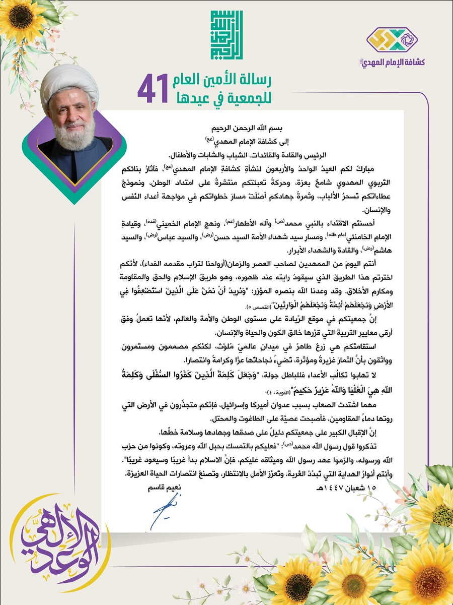 عدد الزوار: 15 رسالة معايدة من الأمين العام لحزب الله سماحة الشيخ نعيم قاسم لجمعية كشافة الإمام المهدي (عجل الله فرجه الشريف) في عيدها الواحد والأربعين 04-02-2026