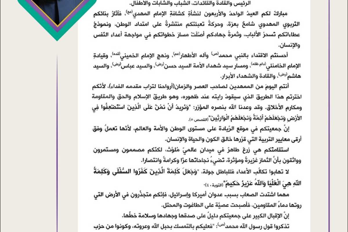 نُعزي ونُبارك لِصاحب العصر والزمان الإمام المهدي (عج) والأمة الإسلامية، وأحرار العالم، والشعب الإيراني العظيم، بالشهادة العظيمة المباركة لِقائدنا وولينا الإمام السيد علي الخامنئي (قدس سره) الذي حصل على أعظم أوسمة العزة والإخلاص والمقاومة والتفاني في سبيل الله تعالى وهو وسام الشهادة على طريق سيد الشهداء الإمام الحسين (ع).