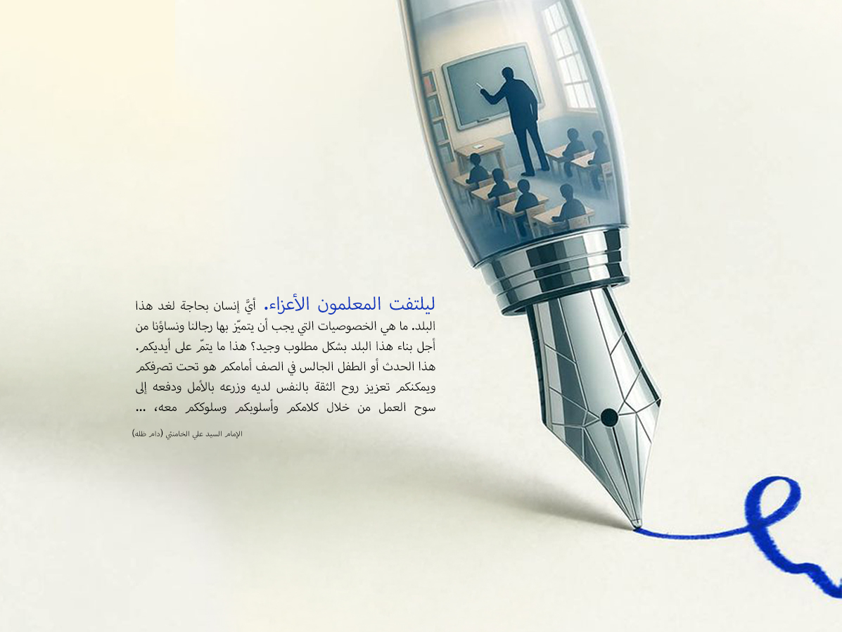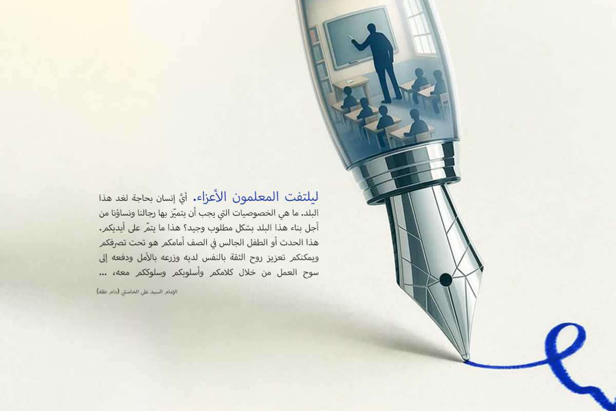 ليلتفت المعلمون الأعزاء. أيَّ إنسان بحاجة لغد هذا البلد. ما هي الخصوصيات التي يجب أن يتميّز بها رجالنا ونساؤنا من أجل بناء هذا البلد بشكل مطلوب وجيد؟ هذا ما يتمّ على أيديكم. هذا الحدث أو الطفل الجالس في الصف أمامكم هو تحت تصرفكم ويمكنكم تعزيز روح الثقة بالنفس لديه وزرعه بالأمل ودفعه إلى سوح العمل من خلال كلامكم وأسلوبكم وسلوككم معه، وبمقدوركم بثّ روح التدين فيه كما ينبغي له. يمكنكم جعله إنساناً ذكياً دؤوباً اجتماعياً محباً لمصالح المجتمع، وإيقاظ روح الإبداع لديه. معلمنا الواعي يمكنه القيام بكل هذا داخل الصف الدراسي.