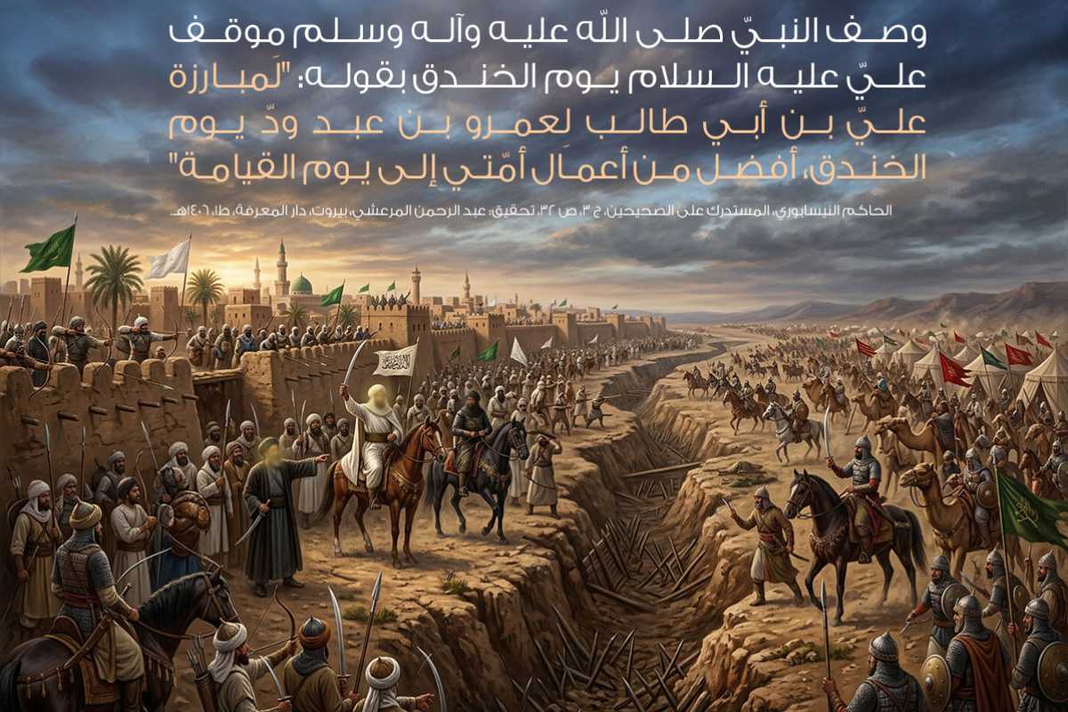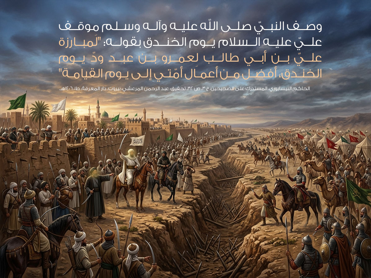 وقد وصف النبيّ صلى الله عليه وآله وسلم موقف عليّ عليه السلام يوم الخندق بقوله: "لَمبارزة عليّ بن أبي طالب لِعمرو بن عبد ودّ يوم الخندق، أفضل من أعمال أمّتي إلى يوم القيامة"[3].